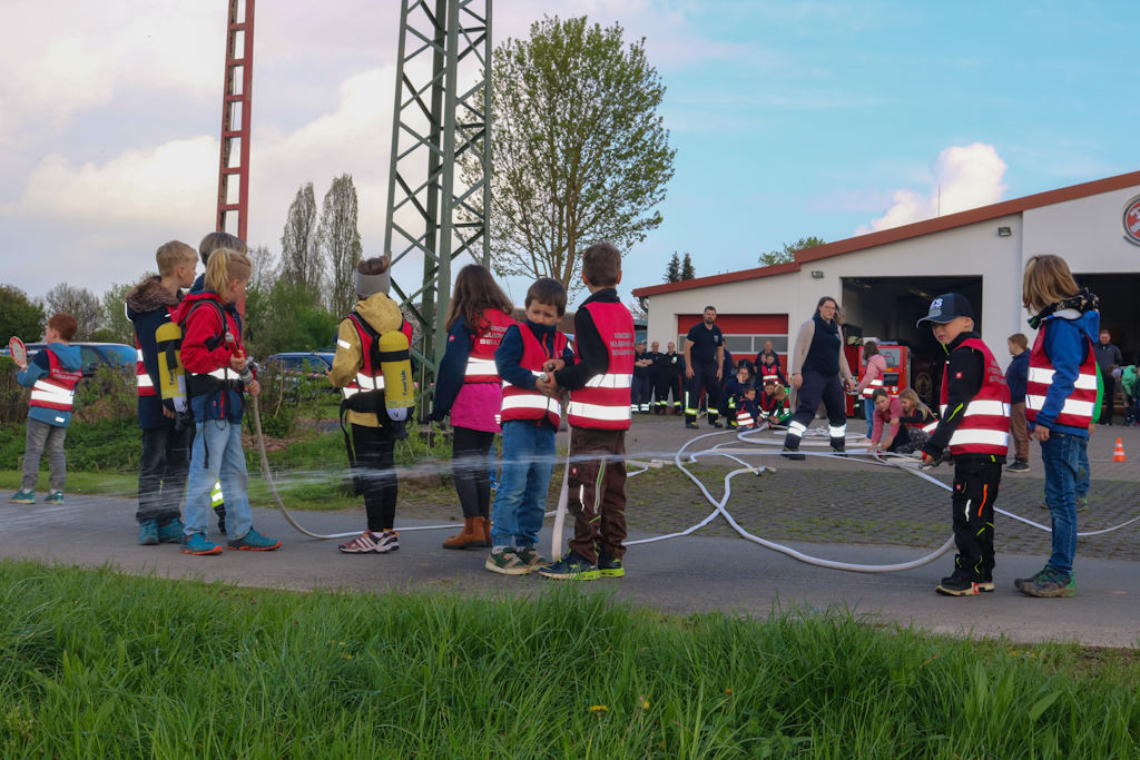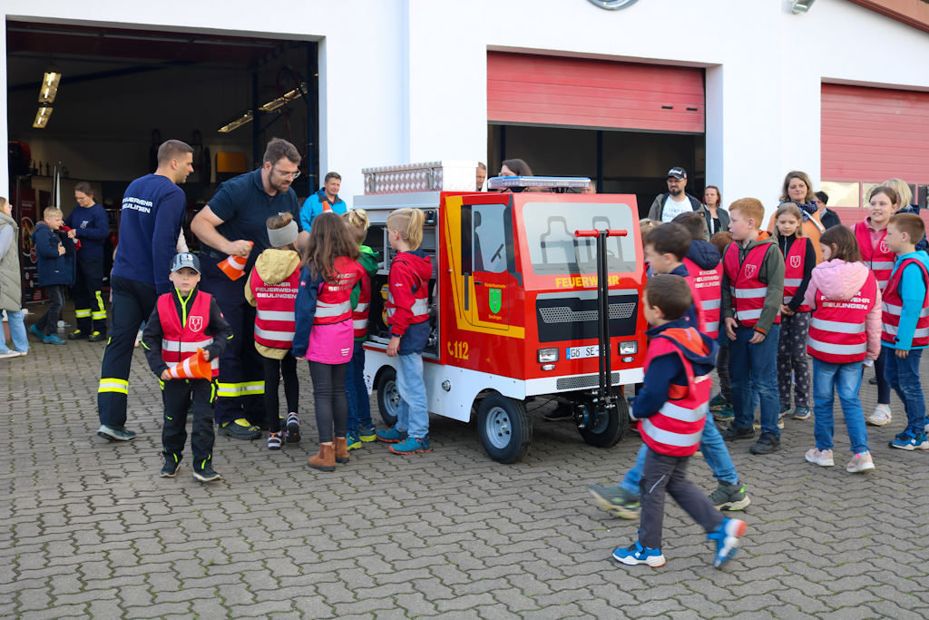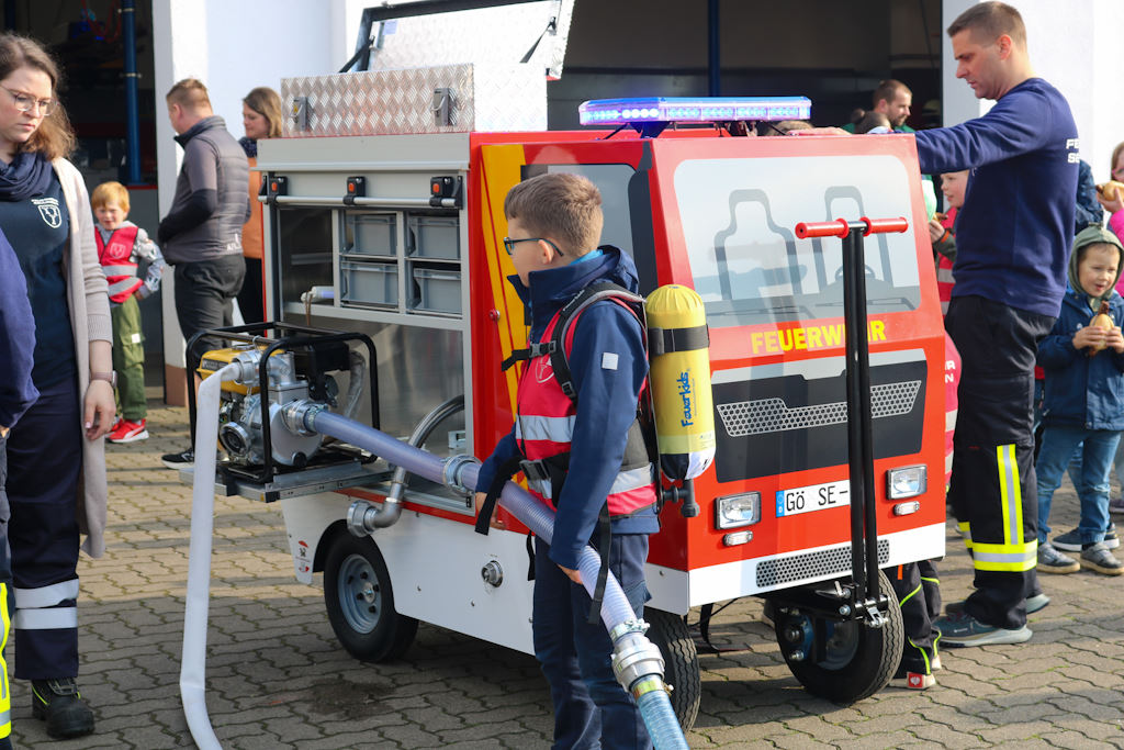 Danach präsentierte die Kinderfeuerwehr ihr Können: Unter der Leitung des Teams der Kinderfeuerwehrwarte rund um Felix Jung zeigten die Nachwuchsbrandschützer bei einer kleinen Showübung mit dem neuen Löschmobil eindrucksvoll, was sie schon alles gelernt haben – und ernteten dafür viel Applaus.