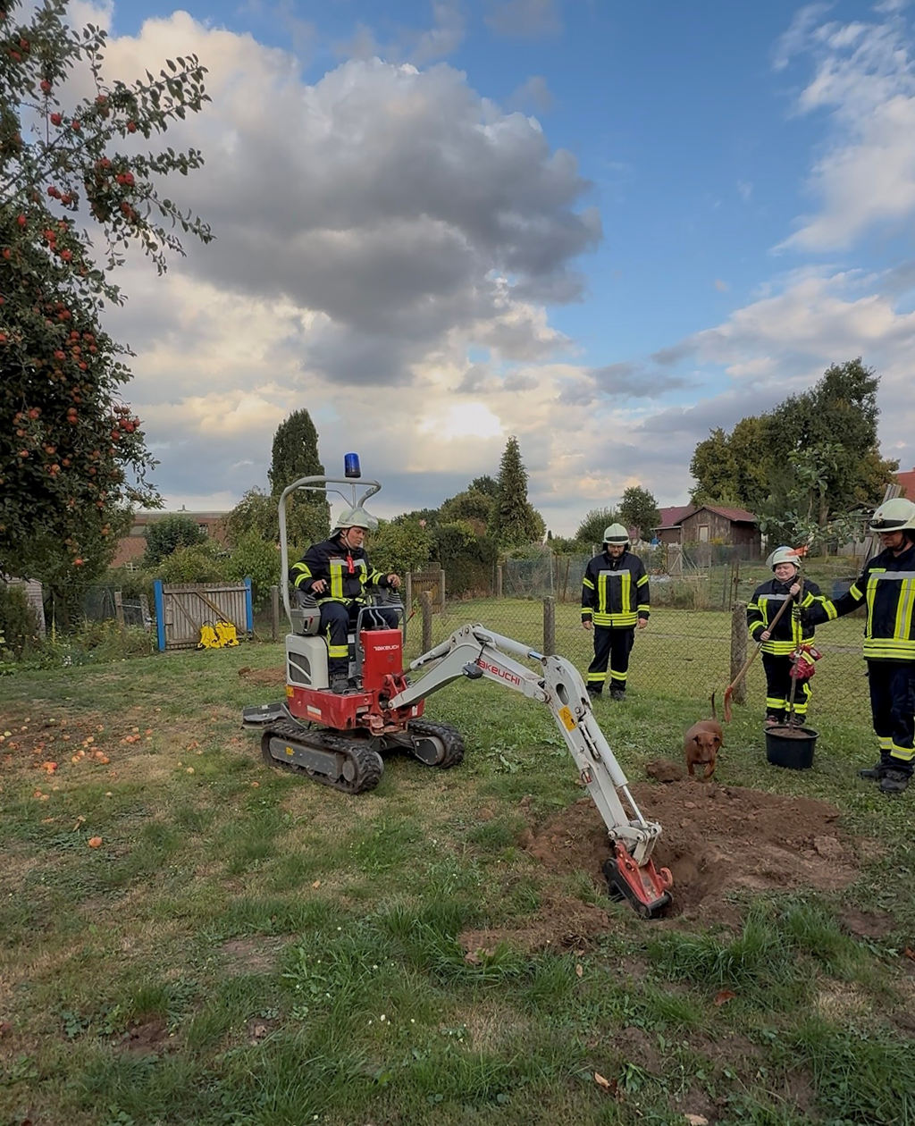 Nach einer kurzen Lageerkundung begann die „Baumrettung“. Mit vereinten Kräften, unter Zuhilfenahme von Schaufeln, Spaten und Muskelkraft sowie dem besonderen Einsatz eines Feuerwehrbaggers, konnten die beiden Bäume sicher eingepflanzt werden. Dank der hervorragenden Zusammenarbeit aller Beteiligten verlief die Aktion reibungslos – und am Ende standen die beiden Bäume fest verwurzelt an ihrem neuen Standort.