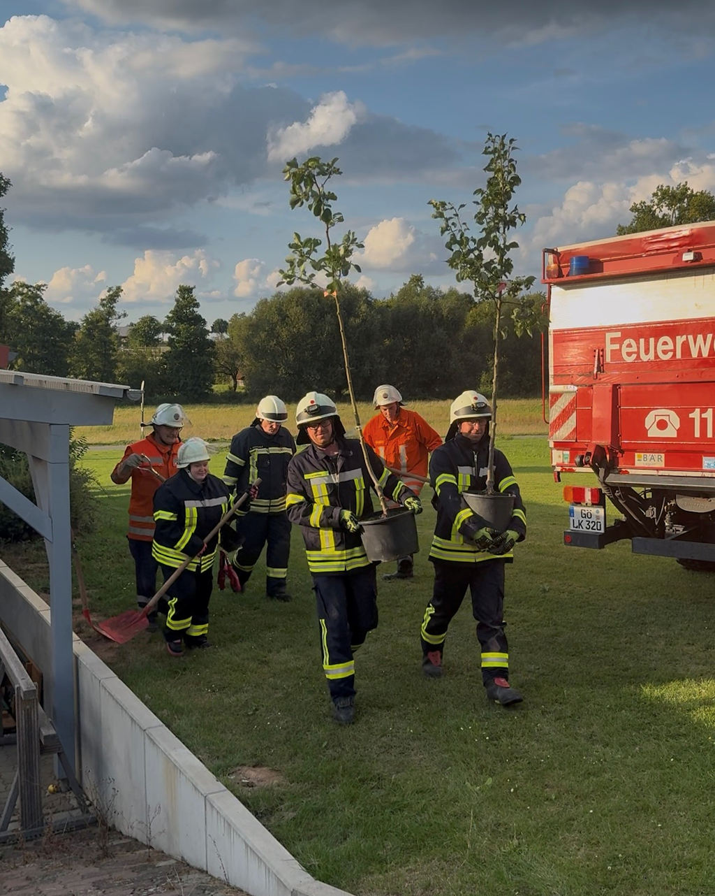 Unter dem spaßigen Einsatzstichwort „H1 – zwei herrenlose Bäume“ rückten wir am Samstagvormittag um 11:55 Uhr mit unserem HLF 20 und dem GW-L2 in den Garten hinter dem Feuerwehrhaus aus. Dort warteten bereits zwei junge Bäume darauf, ihren festen Platz in der Erde zu finden.