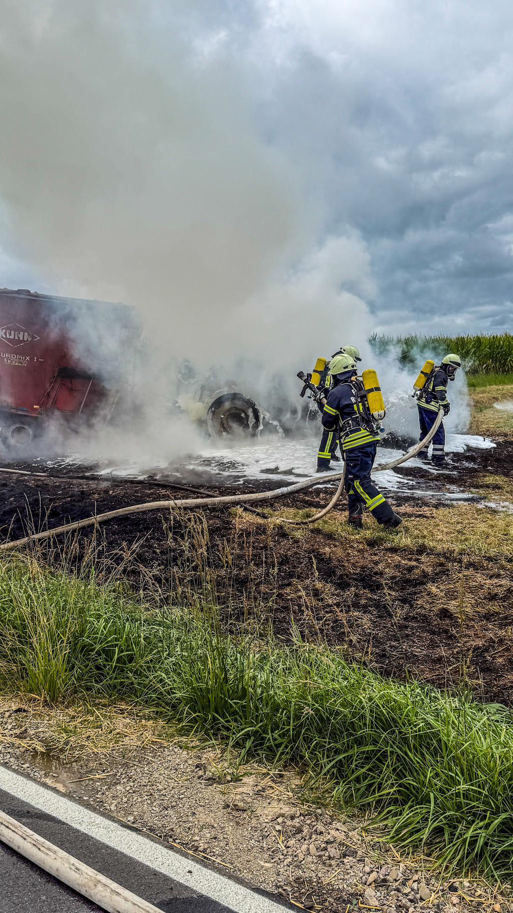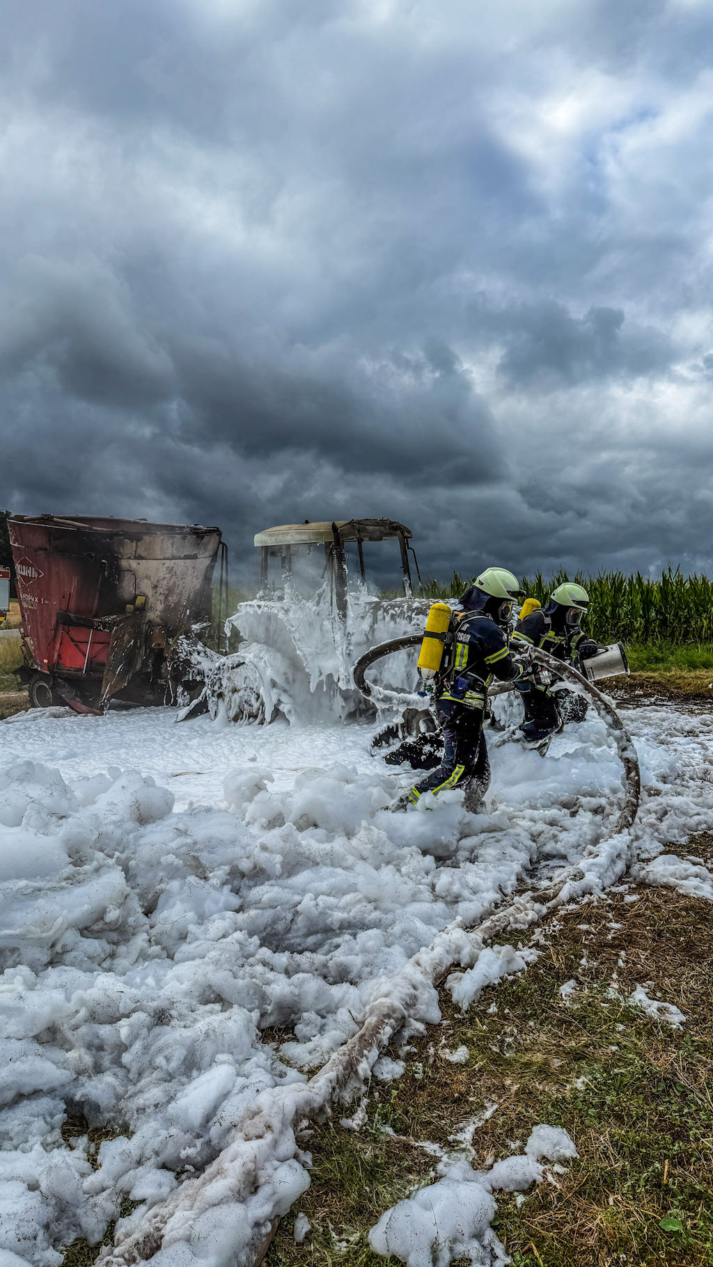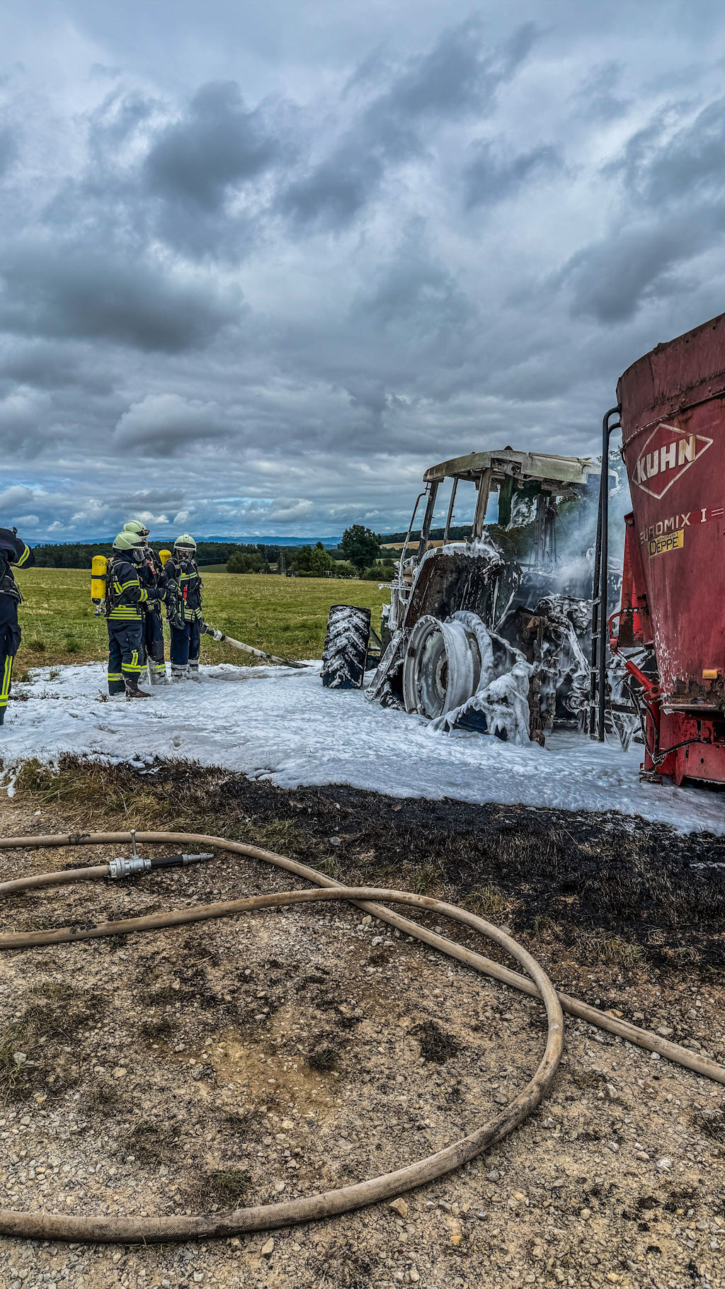 Bereits auf der Anfahrt war eine deutliche Rauchentwicklung sichtbar. Vor Ort bestätigte sich die Lage: Ein Traktor stand in Vollbrand.